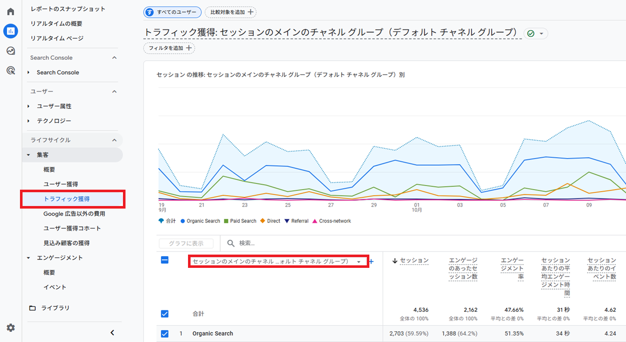 左メニューの[レポート]→[集客]-[トラフィック獲得]をクリックします。