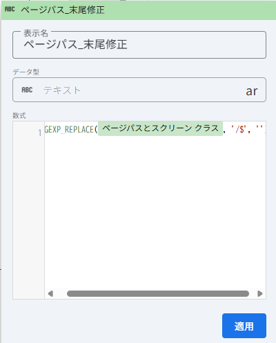 「REGEXP_REPLACE(ページパスとスクリーン クラス, '/$', '')」