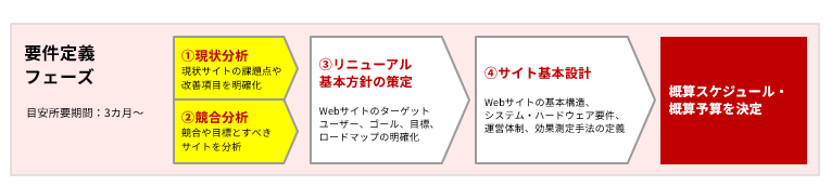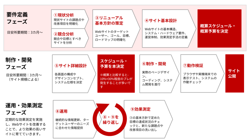 サイトリニューアルは大きく「要件定義」「制作・開発」「運用・効果測定」の3つのフェーズに分かれますが、最も重要な基礎固めとなるのが最初の「要件定義フェーズ」です。