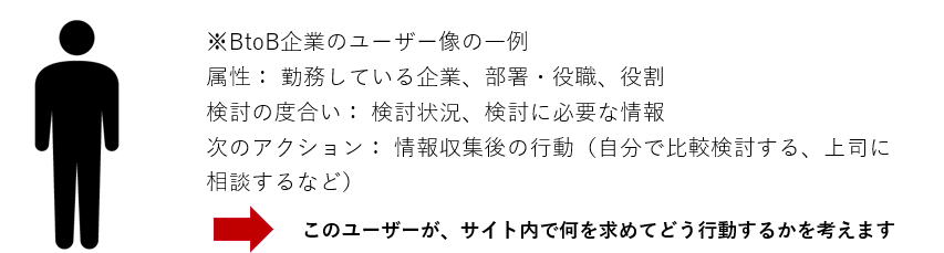 BtoB企業であれば、「勤務している企業」「部署・役職」「役割」「検討状況」「検討に必要な情報」「情報収集後の行動(自分で比較するか、上司に相談するか)」といった項目を書き出し、ユーザーがサイト来訪後にどのような行動をとるのかを想像し、見える化していきいます。